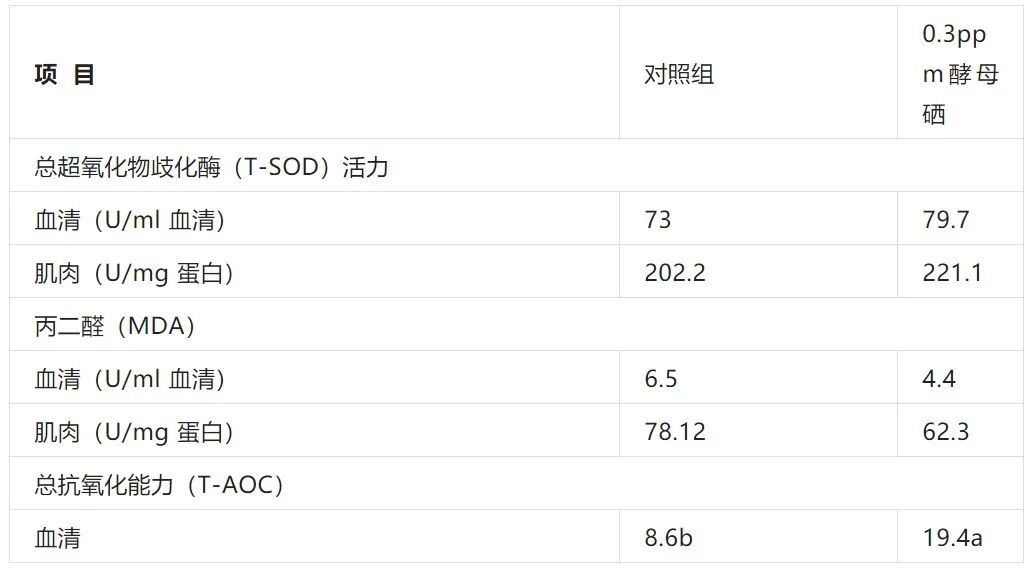 此外,下表中的數(shù)據(jù)顯示,酵母硒還能提高總超氧化物歧化酶的活力。