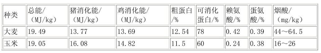 大麥由于適應性廣、抗逆性強而在世界各地栽培。我國大麥種植面積大,幾乎遍及全國,長江中下游的湖北、安徽、江蘇、浙江、上海等省市的種植面積約占全國大麥種植面積的1/2,占全國大麥總產(chǎn)量的2/3。大麥具有抗逆性,可種植在新圍墾的海灘和鹽堿地上。大麥作為飼料其價格比玉米低0.2~0.4元/kg,飼用價值相當于玉米的95%,淀粉含量略低于玉米,粗蛋白質比玉米高 10%,尤其是可消化蛋白明顯高于玉米(見表1)。從氨基酸組成看,賴氨酸幾乎是玉米的2倍,蛋氨酸略高于玉米,與家畜生長發(fā)育密切相關的煙酸含量比玉米高2倍多。Kempster(1976)的自由擇食試驗證明,禽類最喜歡吃的是小麥和大麥,然后是玉米和高粱。麥類的粘合性好,用麥類做顆粒飼料,可以不用粘結劑。利用氨基酸平衡原理,用大麥替代部分玉米和豆餅飼喂畜禽,可減少蛋白質飼料的用量,降低飼料成本,還可增加禽肉的脂肪硬度,改善胴體品質。